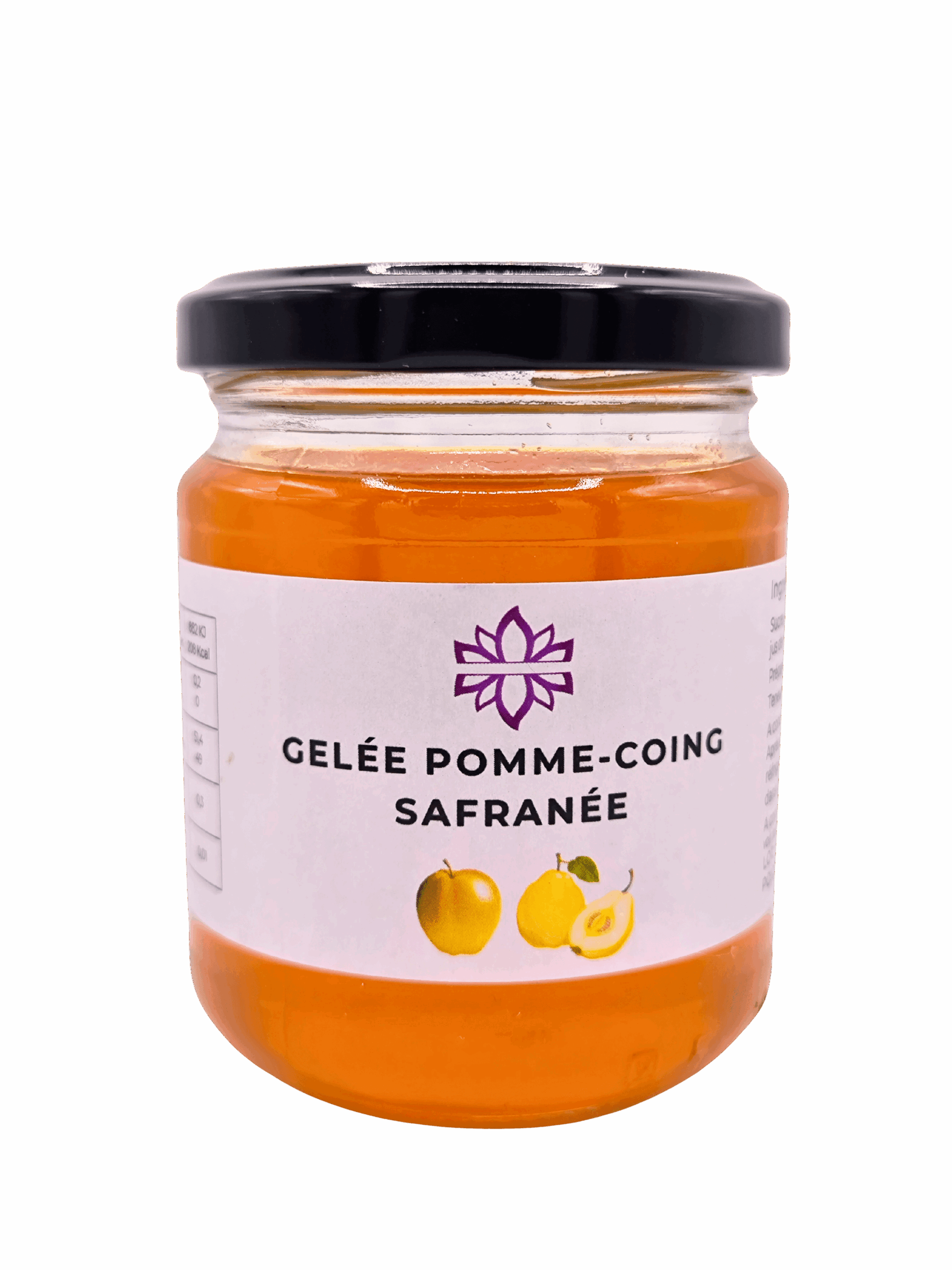 Gelée artisanale pomme-coing safranée , 100 % naturelle. Saveur fruitée et florale, parfaite pour fromages, desserts ou cadeaux gourmets.
